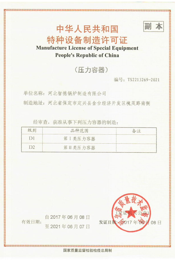 經(jīng)審查,獲準(zhǔn)從事第Ⅰ類(lèi)壓力容器和第Ⅱ類(lèi)壓力容器的制造。